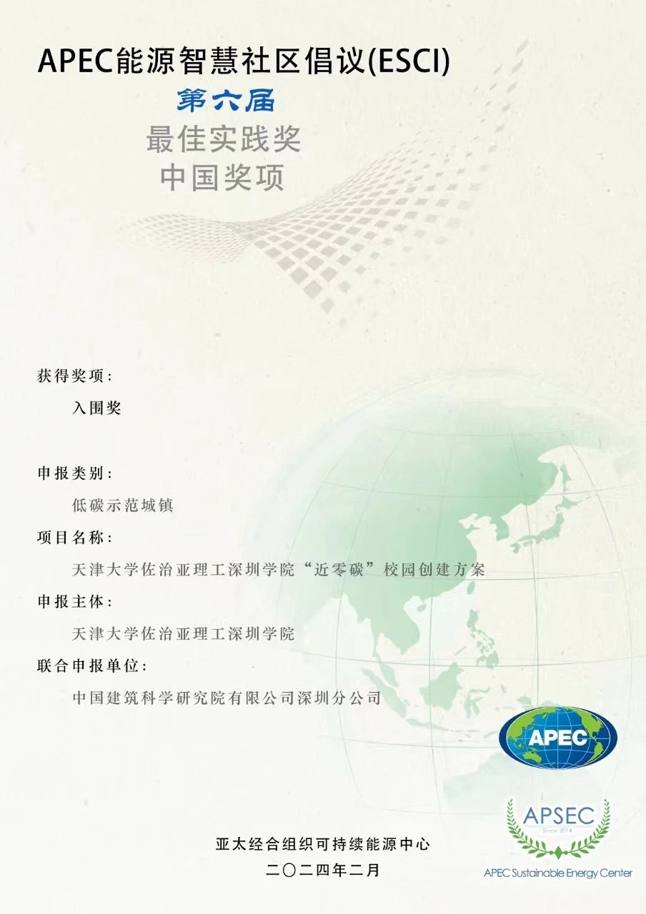 近日,由中國建研院深圳分公司承接的“近零碳”校園咨詢項目——天津大學佐治亞理工深圳學院成功獲得第六屆APEC能源智慧社區(qū)倡議(ESCI)最佳實踐獎中國獎項“入圍獎”。
