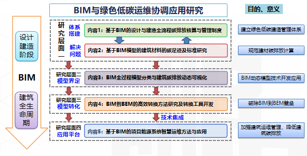 科研團(tuán)隊(duì)主要解決BIM與綠色低碳協(xié)同發(fā)展中各類信息模型數(shù)據(jù)無法共享、信息模型轉(zhuǎn)換工具缺失的問題和BIM在能耗與碳排放量計(jì)算、碳足跡與碳排放監(jiān)測、能源與碳排放運(yùn)維管理方面的技術(shù)管理協(xié)同問題。針對BIM低碳技術(shù)管理協(xié)同問題,將通過基于BIM模型的建筑材料的碳足跡及標(biāo)準(zhǔn)研究和設(shè)計(jì)與建造全流程碳排放核算與管理制度研究,編制科學(xué)合理的建筑材料碳足跡評級和碳排放核算標(biāo)準(zhǔn),實(shí)現(xiàn)建筑設(shè)計(jì)及建造階段綠色低碳建造管理體系搭建。針對BIM低碳技術(shù)支持協(xié)同方面,將通過BIM到BEM的高效轉(zhuǎn)換方法研究及轉(zhuǎn)換工具開發(fā)、基于BIM 的能源系統(tǒng)實(shí)時仿真與智慧運(yùn)維技術(shù)研究與應(yīng)用等,破除BIM到BEM的信息壁壘,實(shí)現(xiàn)項(xiàng)目基于BIM協(xié)同的綠色智慧低碳運(yùn)維,有效降低深汕糧食儲備庫項(xiàng)目的能源消耗和碳排放。