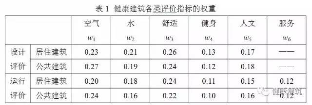 第3.2.7條規定了《標準》中各評價指標的權重。《標準》在各指標權重研究中,以“抓主因、顧次因”的原則充分考慮了不同類型的民用建筑的健康影響因素,并按照民用建筑的分類,建立了居住建筑和公共建筑指標權重的調研問卷,采用問卷調查、層次分析、專家咨詢、項目試評等多途徑結合的方式,建立了健康建筑各類評價指標的權重,見表1。